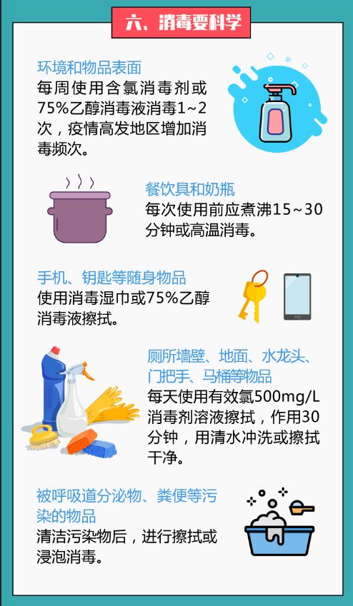 四、做好环境和物品的消毒。地面及桌椅台面、床围栏、门把手、电话、玩具等物体表面应每天清洁,每周使用含氯消毒剂或75%乙醇消毒液消毒1-2次;流行区域应增加消毒频次。餐饮具、奶瓶每次使用前应煮沸15-30min或高温消毒。随身携带的手机和钥匙使用消毒湿巾或75%乙醇消毒液擦拭。