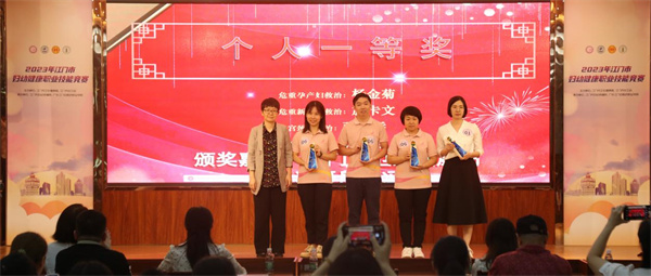 经过激烈的角逐,最终评选出个人奖、单项奖、团队奖、优秀组织奖、最佳精神风貌奖并进行现场颁奖。其中,各竞赛项目个人奖第一名的参赛选手被江门市妇幼健康职业技能竞赛组委会授予“侨乡妇幼健康先锋”称号。