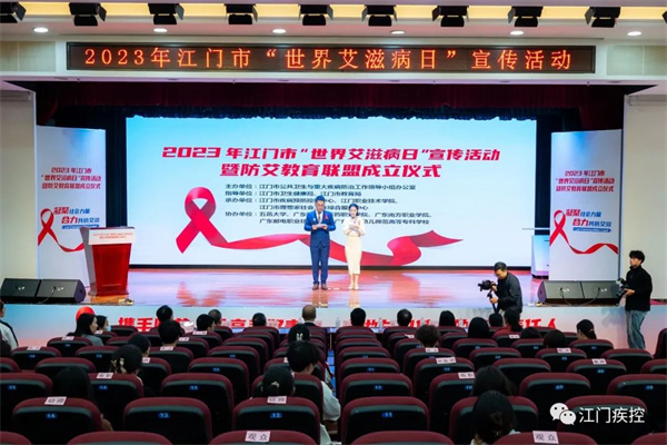 为推动我市艾滋病防治工作高质量开展,深入宣传“每个人是自己健康第一责任人”理念,普及艾滋病防治知识和技能,12月1日下午,江门市公共卫生与重大疾病防治工作领导小组办公室联合江门市卫生健康局、江门市教育局、江门职业技术学院、江门市疾病预防控制中心、江门市理想家社会工作综合服务中心等在江门职业技术学院明德堂举行2023年江门市“世界艾滋病日”宣传活动暨防艾教育联盟成立仪式。