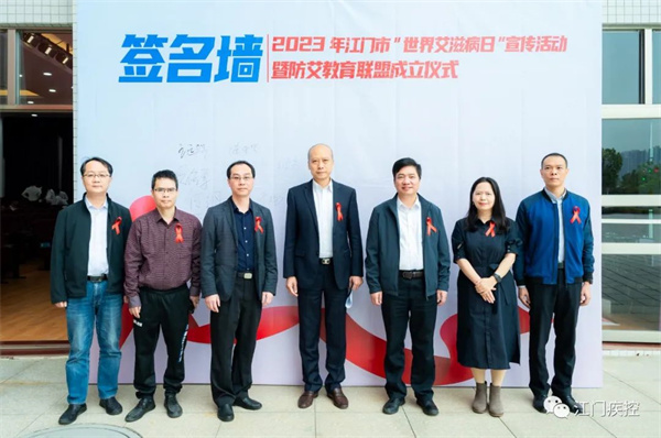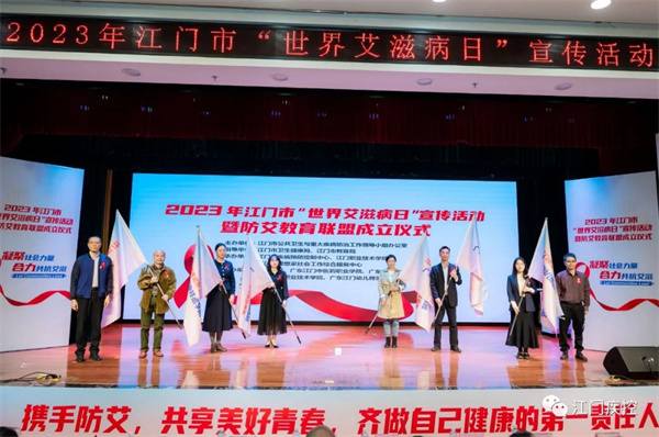 为呼吁江门市区高校切实承担起艾滋病防控主体责任,巩固现有防控成果,持续加强校园艾滋病防控工作,当天还举行了江门市高校防艾教育联盟成立仪式,江门市卫生健康局、江门市教育局代表共同为五邑大学、江门职业技术学院等6所学校授旗。据悉,本次成立高校防艾教育联盟,旨在进一步整合各方资源,助力各校拓展防艾教育工作“朋友圈”,共同构建校园防艾教育共同体,为全市校园防艾工作提供强有力的平台支撑。