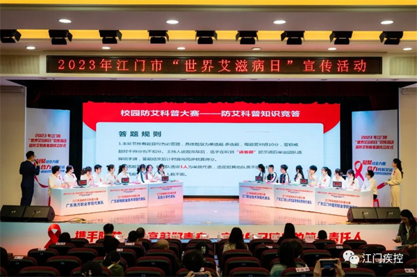 江门市卫生健康局副局长王远胜、江门职业技术学院副校长陈中坚、江门市疾病预防控制中心主任杨立峰、广东省性病艾滋病防治协会秘书长于扬、江门市教育局德体卫艺科科长李胜前、江门市卫生健康局疾控科科长尹启亮、江门疾病预防控制中心副主任文美贞出席活动。江门市区大专院校师生代表合共200多人参与活动。