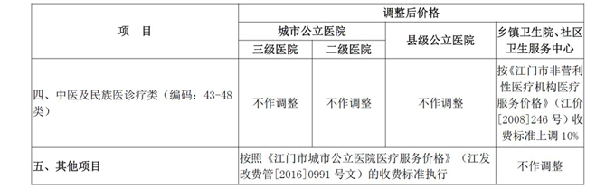 《调价方案》的主要内容:一是取消医用耗材加成,同步调价。公立医疗机构取消医用耗材加成所减少收入,通过合理调增部分诊查、治疗和手术等体现医务人员技术劳务价值的收费项目,调减部分超声检查等收费项目(详见附表);二是统一全市公立医疗机构价格体系。医疗服务价格由市级物价主管部门统一制定,实现全市公立医疗机构实行统一的价格体系。三是医疗服务价格实行分级定价。全市公立医疗机构按三级城市公立医院、二级城市公立医院、县级公立医院、基层医疗机构四个标准分级定价,以三级城市公立医院价格为最高收费标准,其他级别公立医疗机构按三级城市公立医院价格标准适当下浮。四是落实对儿科、中医倾斜支持政策。根据省有关政策文件要求:对于六岁及以下儿童的临床诊治等体现儿科医务人员技术劳务特点和价值的医疗服务项目,实行不超过30%的加收政策。调整后我市六岁及以下儿童的住院诊查费均加收约10%,其余项目不加收;基层医疗卫生机构(乡镇卫生院、社区卫生服务中心)部分中医诊疗类项目按《关于调整江门市非营利性医疗机构医疗服务价格的通知》(江价〔2008〕246号)收费标准上调10%。