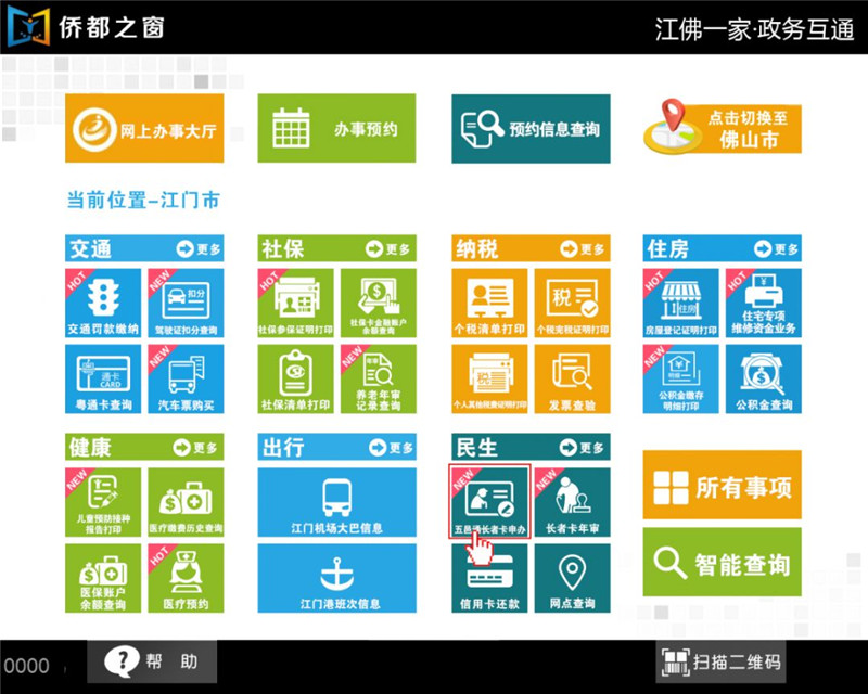 目前,江门市区超过300多个“侨都之窗”自助终端支持办理五邑通长者卡申办及年审服务,极大地方便了长者办理公交乘车卡的业务。