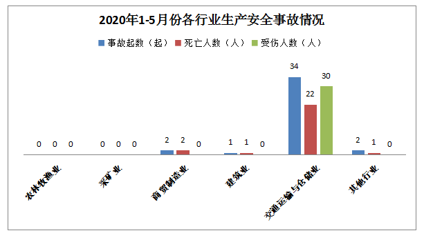 1-5月,全市共发生生产安全事故39起,其中商贸制造业2起,建筑业1起,道路运输事故34起,其他行业事故2起。