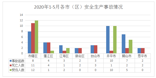 1-5月,市辖区发生交通运输和仓储业事故8起(其中道路运输事故6起、水上运输事故2起);蓬江区发生事故4起(其中道路运输事故3起、建筑业1起);江海区发生道路运输事故3起;新会区发生事故2起(其中道路运输事故1起、其他行业事故1起);台山市发生事故3起(其中道路运输事故2起、商贸制造业1起);开平市发生道路运输事故10起;鹤山市共发生事故7起(其中道路运输事故6起、其他行业事故1起);恩平市发生事故2起(其中道路运输事故1起、商贸制造业事故1起)。