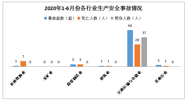 1-6月,全市共发生生产安全事故53起,其中农林牧渔业1起、商贸制造业3起,建筑业1起,交通运输和仓储业46起,其他行业2起。