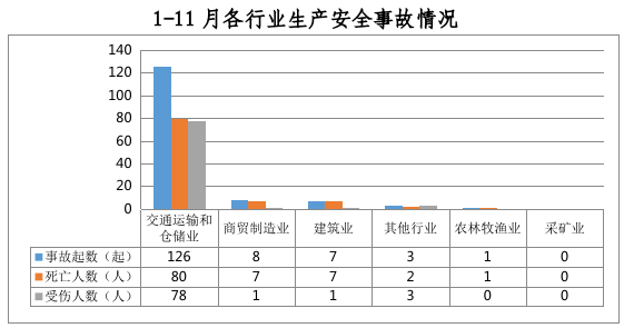 全市共发生生产安全事故145起,其中交通运输和仓储业126起、占86%,商贸制造业8起、占6%,建筑业7起、占5%,其他行业3起、占2%,农林牧渔业1起、占1%。采矿业未发生生产安全事故。