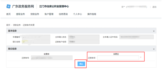 (2)进入详情页面后,输入新的还款账号并点击“确认”按钮,提交上报。