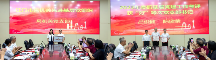 会议在雄壮的国歌声中开始,在宣读有关表彰决定后,局领导为老党员欧湛光颁发了“光荣在党50年”纪念章,向获得江门市“两优一先”表彰的优秀党务工作者吕俊健、获得市直机关工委先进基层党组织——机关党组织表示祝贺,并为获得江门市政务服务和数据管理局表彰的优秀党支部书记、优秀共产党员颁发了荣誉证书。