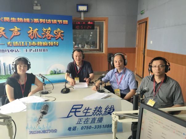 在第515期的《民生热线》节目中,江门市环保局局长陈旻,副局长赵炎强、叶水生,环境监察分局局长何宇珩就我市的环保宣传、环境执法以及水污染防治等热点话题通过热线电话、微信、短信平台与听众进行了直接沟通。