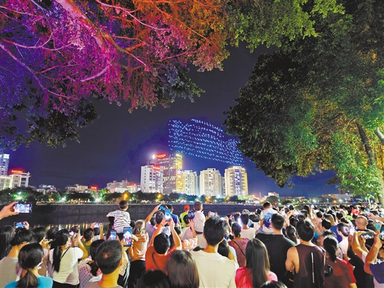 精彩的无人机灯光秀表演吸引众多群众前往观看。