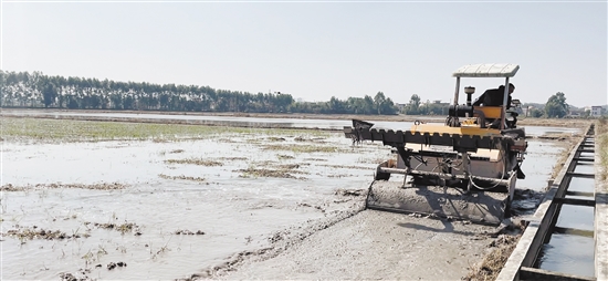 目前,鹤山市春耕已基本实现全部机械化。图为履带式旋耕机作业。