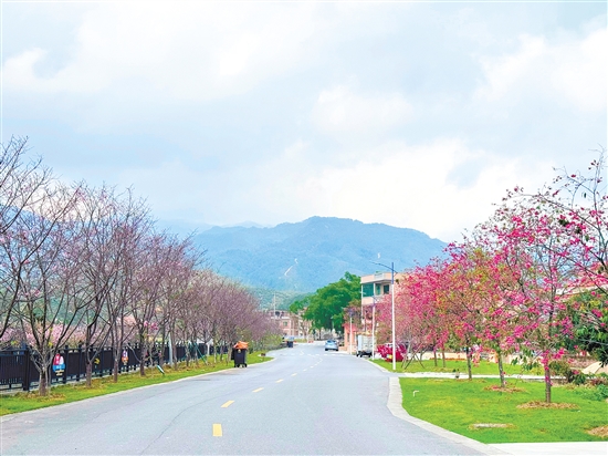 城西村樱花大道种植了蓝花楹、樱花等2000多棵。图为“报春樱花”争相绽放。