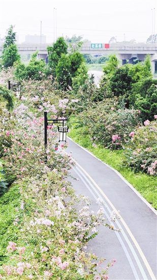 苍江绿廊绵延数百米的紫薇花,正成团成簇沿线绽放。