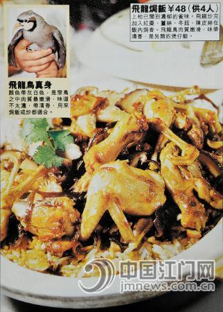 镬仔炆雀鸟98元。将5种雀鸟炒成一镬,有飞龙鸟、野鸽、野鸡、麻雀、夜游,切成一块块后加姜片、葱头、香芹等一起炒。吃时再蘸些辣椒酱油,味道更惹味,雀味更突出。