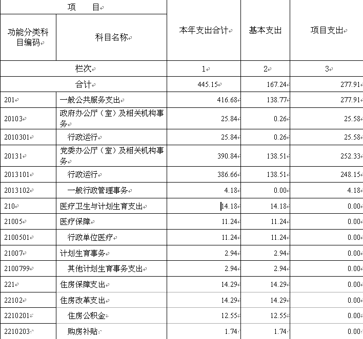 分功能科目看,一般公共服务(类)(款)416.68万元,主要用于基本支出138.77万元,项目支出277.91万元;医疗卫生与计划生育支出14.18 万元,主要用于医疗保障11.24万元,计划生育事务2.94万元;住房保障支出14.29万元,主要用于 住房改革支出14.29万元。