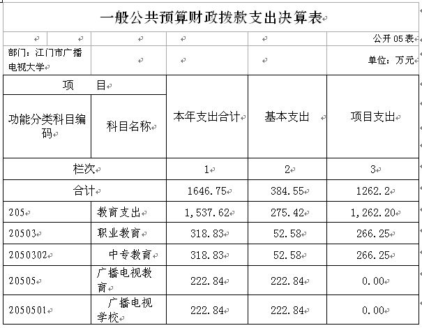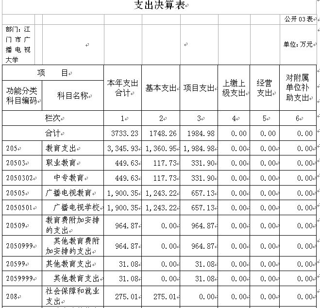 江门市广播电视大学2015年度支出合计3733.23万元。具体如下;