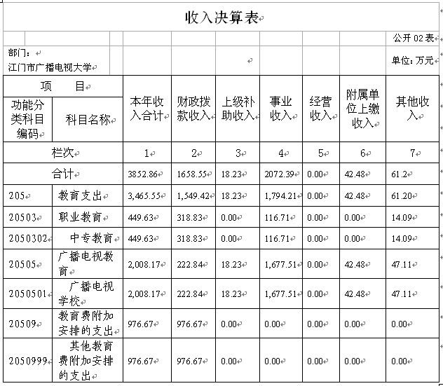 江门市广播电视大学2015年度总收入3852.86万元,其中本年收入3852.86万元。具体情况如下: