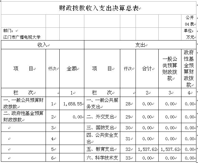 江门市广播电视大学2015年度财政拨款收入合计1658.55万元。其中:一般公共预算财政拨款收入1658.55万元。