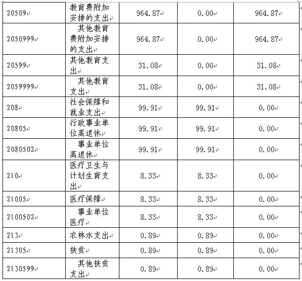 (一)基本支出1748.26万元,占本年支出合计的46.83%。其中:教育支出1360.95万元,主要用于教育的各类支出;社会保障和就业支出275.01万元,主要用于员工社会保障支出;医疗卫生与计划生育支出22.41万元,只要用于:医疗保障;农林水支出0.89万元,只要用于扶贫;住房保障支出89万元,只要用于住房改革支出。(二)项目支出1984.98万元,占本年支出合计的53.17%。其中:教育支出1984.98万元,主要用于教育各类安排的支出;(三)上缴上级支出0万元,占本年支出合计的0%。(四)经营支出0万元,占本年支出合计的0%。(五)对附属单位补助支出0万元,占本年支出合计的0%。