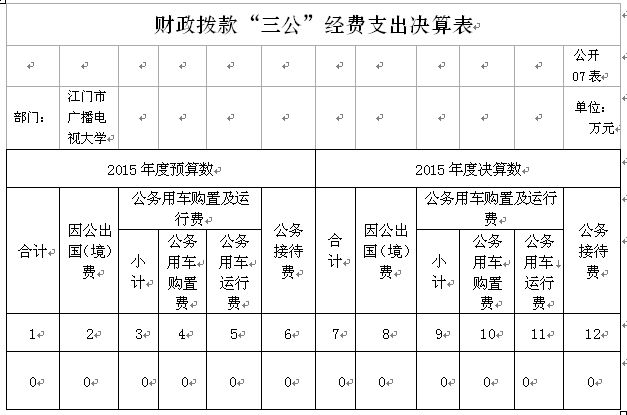 3.公务接待费支出0万元。2015年,江门市广播电视大学及下属1个单位共接待国外来访团组0个,来访外宾0人次。