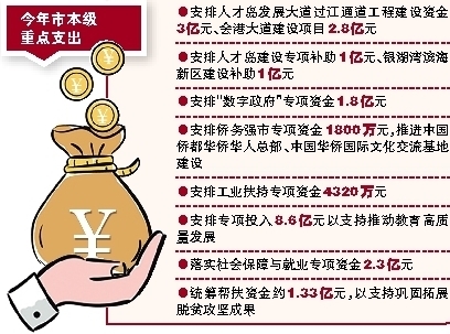 在立体交通网络构建方面,市本级财政将安排人才岛发展大道过江通道工程建设资金3亿元、会港大道建设项目2.8亿元等重大基础设施建设,以及强化江门站始发功能。在支持打造大湾区重大产业发展平台方面,今年我市将安排人才岛建设专项补助1亿元、银湖湾滨海新区建设补助1亿元等。在深化“数字政府”改革、持续优化营商环境方面,将安排“数字政府”专项资金1.8亿元。在打造华侨华人文化交流合作重要平台方面也将安排侨务强市专项资金1800万元,推进中国侨都华侨华人总部、中国华侨国际文化交流基地建设。同时,统筹安排5亿元推动重大项目、重大平台建设。