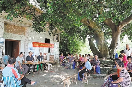 法官在榕树下为群众宣传防范养老诈骗知识。