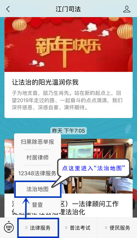 (操作示例:1.进入“江门司法”微信公众号,点击打开底部“法律服务”栏目,在展开的内容中选择“法治地图”,即可显示“我的位置”及周边各法律服务点,点击任一服务点即可查看该服务点的名称、详情、导航等信息)