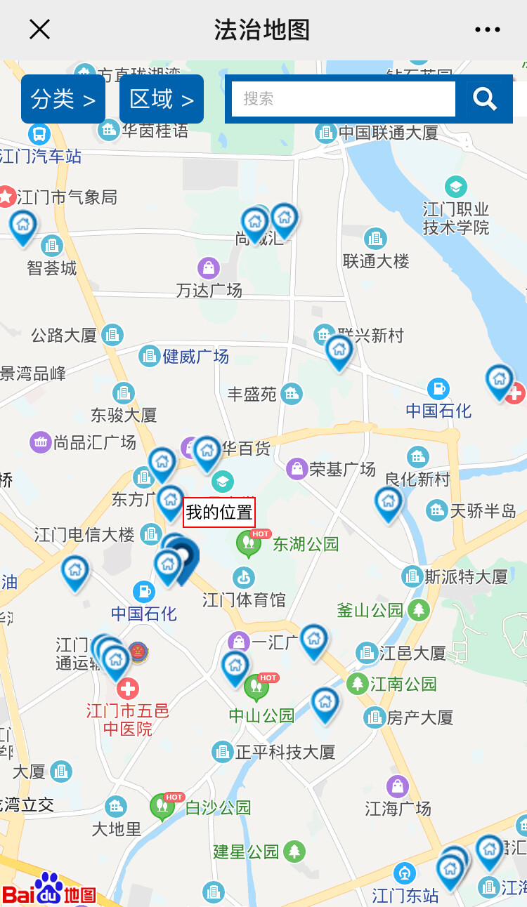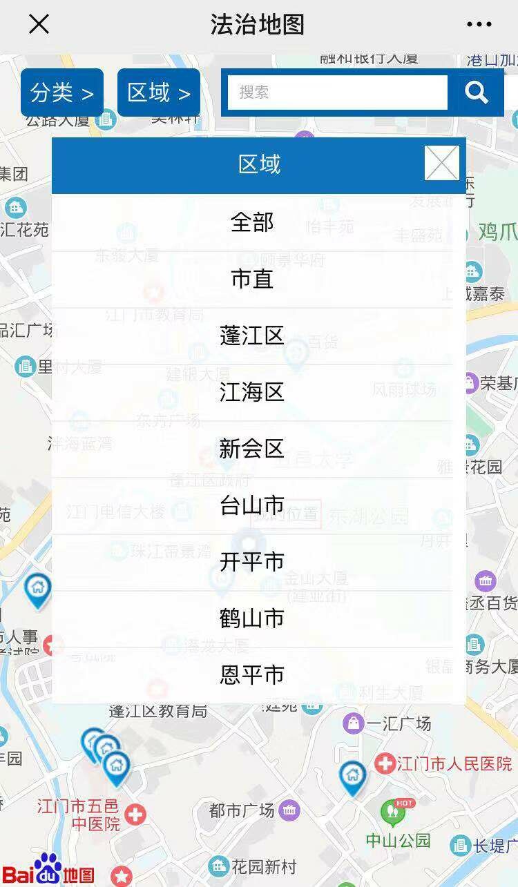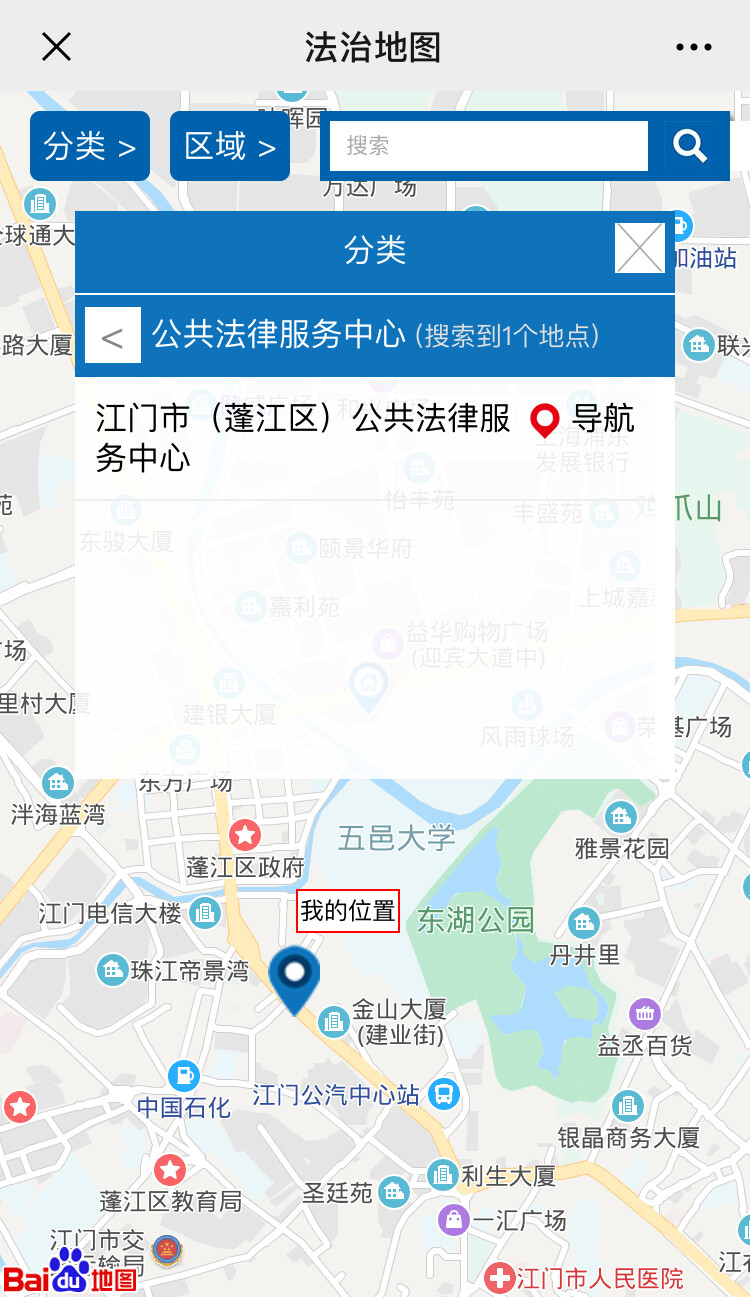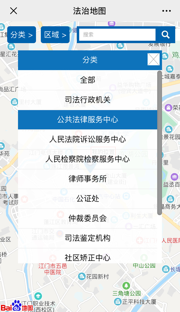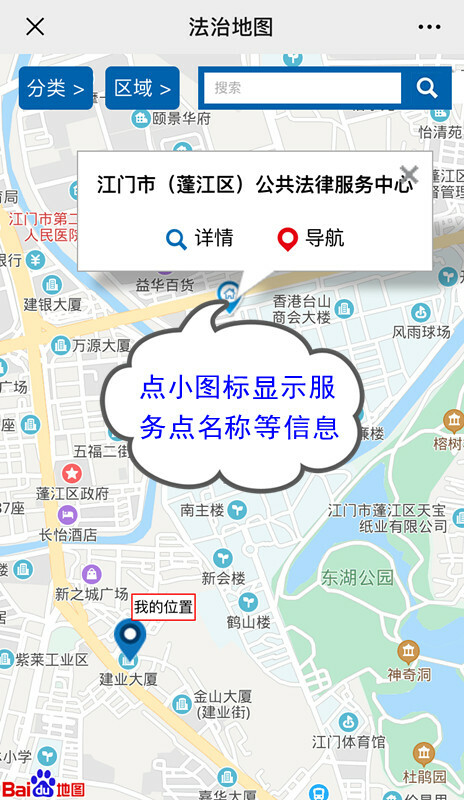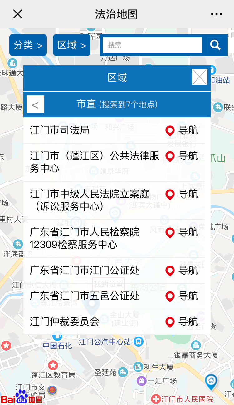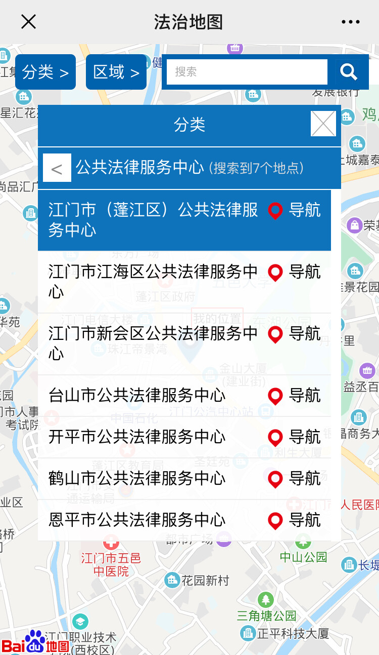(操作示例:5.进入“法治地图”后也可以选择“分类”和“区域”组合使用,如“分类”选择“公共法律服务中心”,“区域”选择“市直”,即只显示江门市本级的公共法律服务中心,点击该服务点即显示该服务点详情、导航等信息)