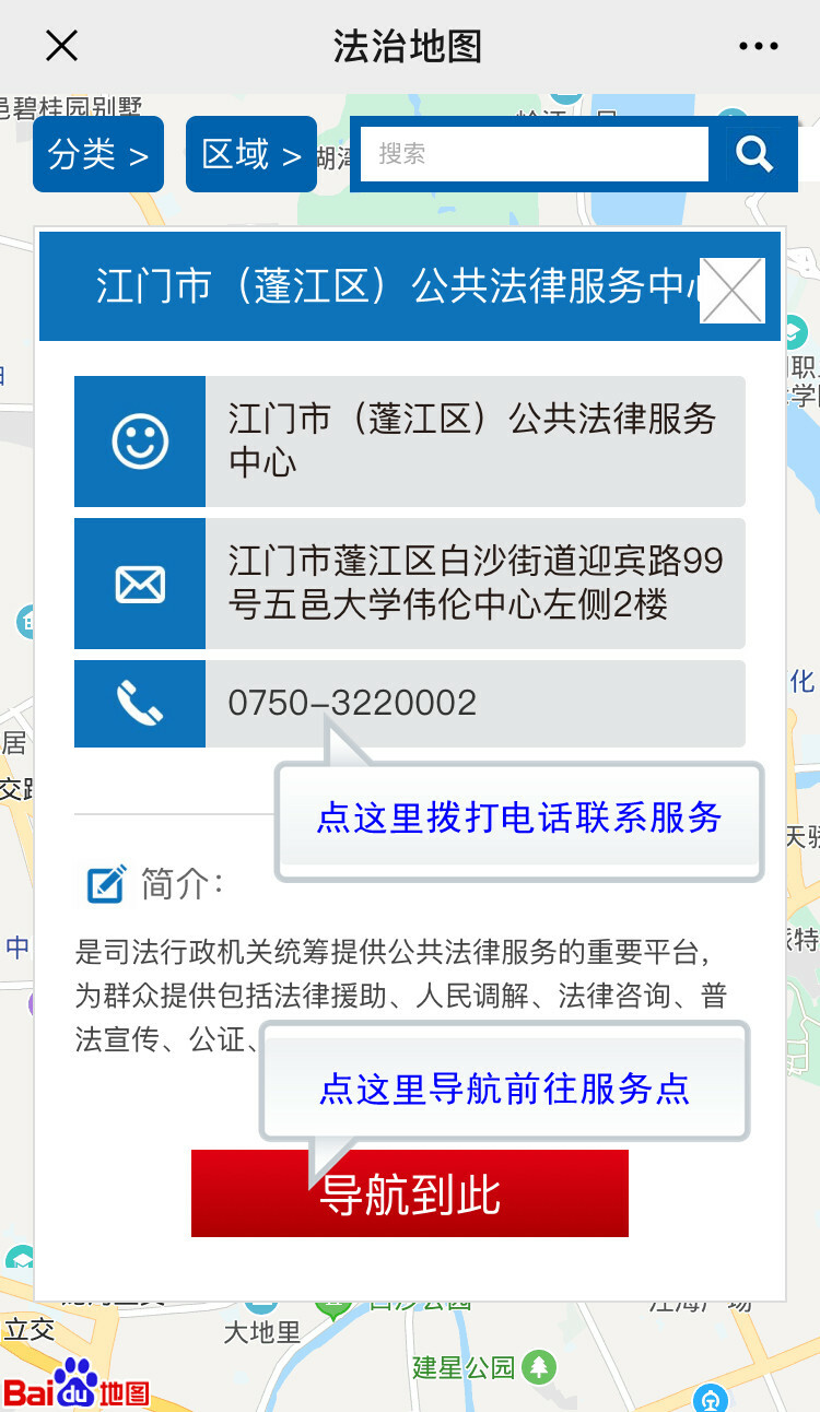 (操作示例:2.如选择查看“江门市(蓬江区)公共法律服务中心”,点击即可查看该服务点名称、地址、导航、联系电话、简介、图片等信息。点击“