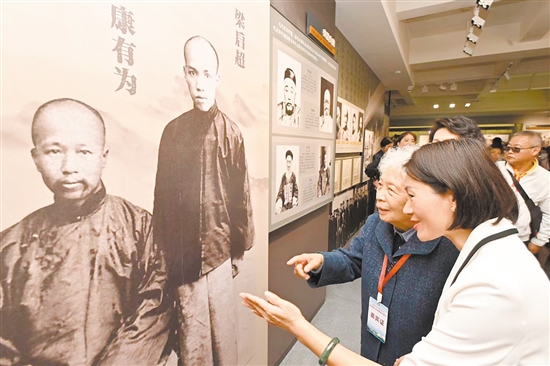 江门举办多场梁启超先生诞辰150周年主题活动,在江门、在 、在海外华侨华人中引发强烈反响。图为梁启超先生后人参观梁启超先生专题展。