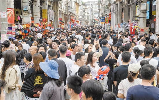 江门“天然摄影棚”的独特魅力远近闻名。图为“五一”假期,各地游客来电视剧《狂飙》取景地长堤历史文化街区打卡。