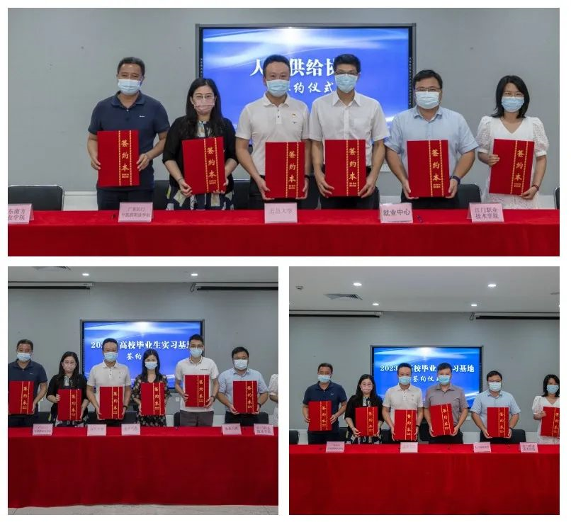 仪式上,江门市人力资源和社会保障局与5所院校签订人才供给协议,5所院校分别与人力资源协会、产业龙头企业代表签订2023届高校毕业生实习基地协议。江门市人力资源和社会保障局向5所院校派发“政策、岗位、服务”礼包。