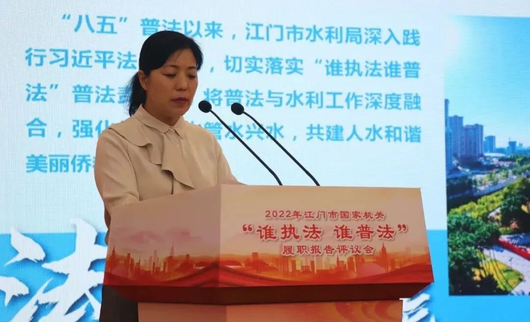 近日,市委依法治市办、市普法办、市司法局在市政府小礼堂联合举办2022年江门市国家机关“谁执法谁普法”履职报告评议会,市水利局局长王作青在评议会上做履职报告,从健全普法“四大机制”、打造普法“四大品牌”、突出普法“四个融合”等三个方面,详细汇报我市水利普法工作情况。同时,通过播放视频、PPT和设置展板、展台等形式,全方位展现我市水利普法工作成效。