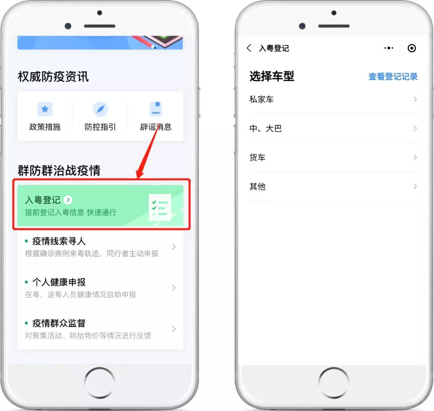 进入“疫情防控服务专区”后,下滑点击“入粤登记”,司机或乘客可根据实际情况选择类型进入登记。后续可从该界面右上角“查看登记记录”进入找到相关登记记录。