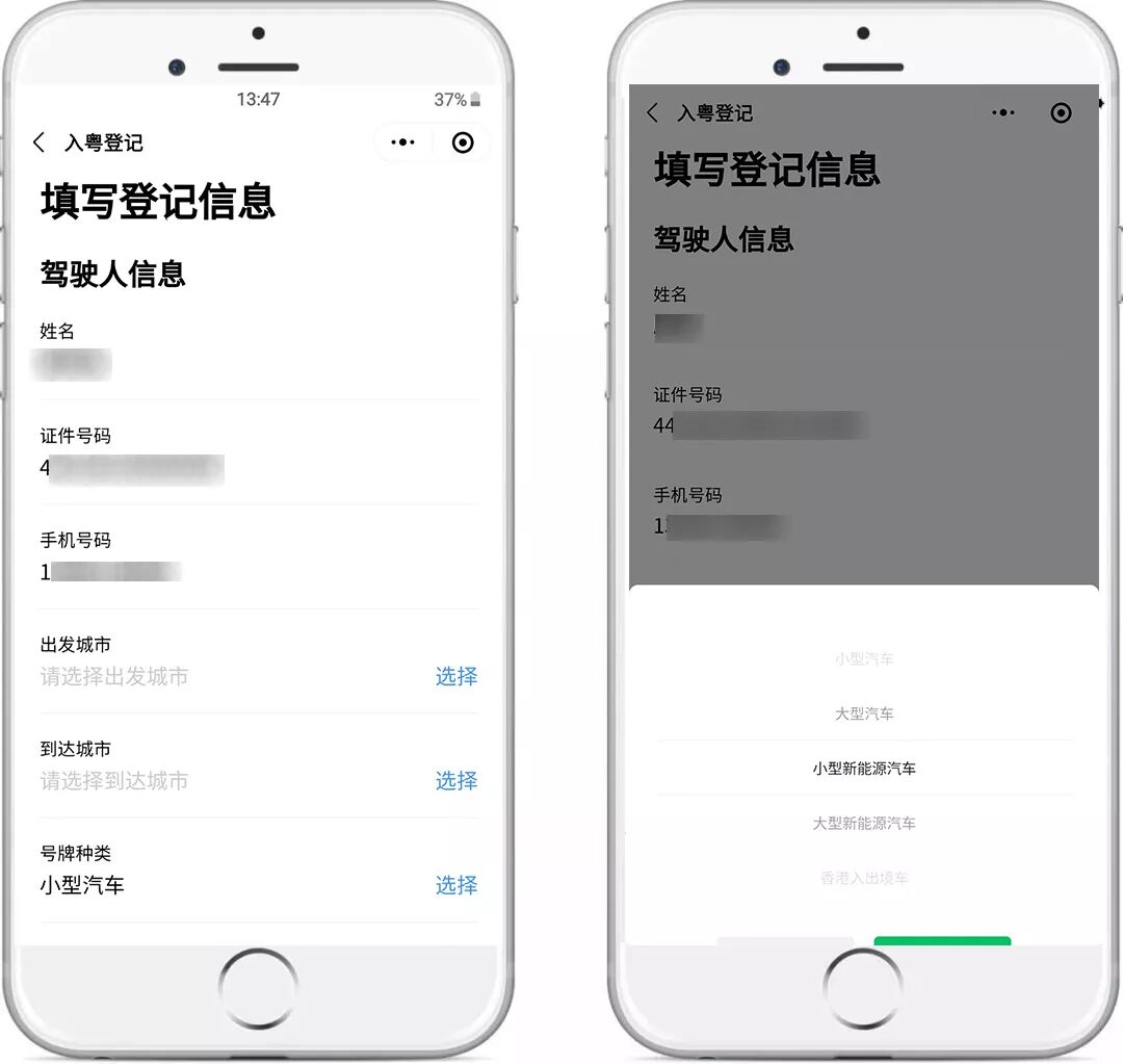 驾驶人在出发前,点击进入“入粤登记”服务,选择相应的车辆类型,阅读服务须知后填写驾驶人信息(注意准确填写号牌种类),如独自驾驶,确认无误后可直接提交。