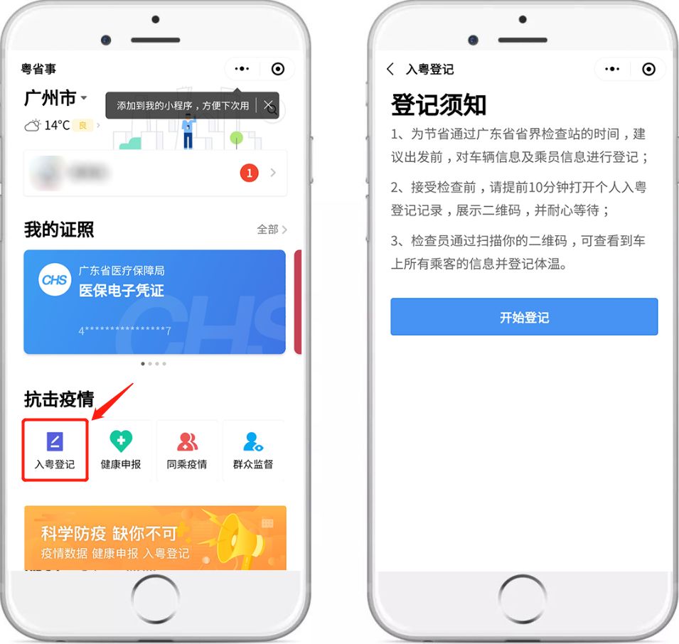 (1)微信搜索进入“粤省事”小程序,首页“抗击疫情”版块,点击“入粤登记”服务。